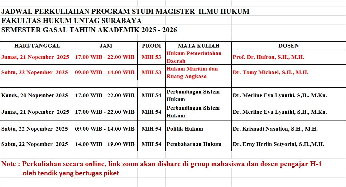 Jadwal Perkuliahan Program Studi Magister Ilmu Hukum (27 - 28 November 2025)